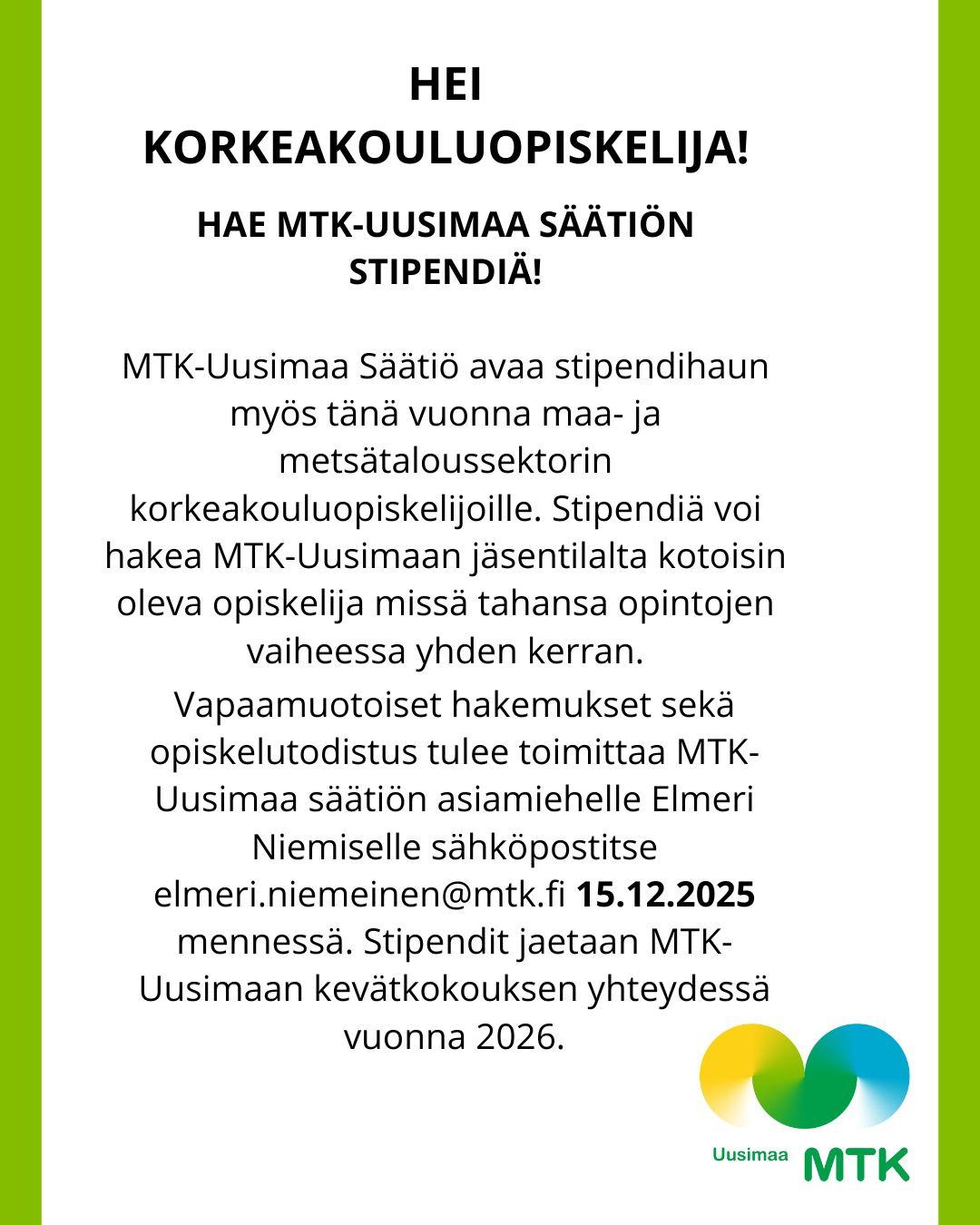MTK-Uusimaa Säätiö avaa stipendihaun myös tänä vuonna maa- ja metsätaloussektorin korkeakouluopiskelijoille. Stipendiä voi hakea MTK-Uusimaan jäsentilalta kotoisin oleva opiskelija missä tahansa opintojen vaiheessa.